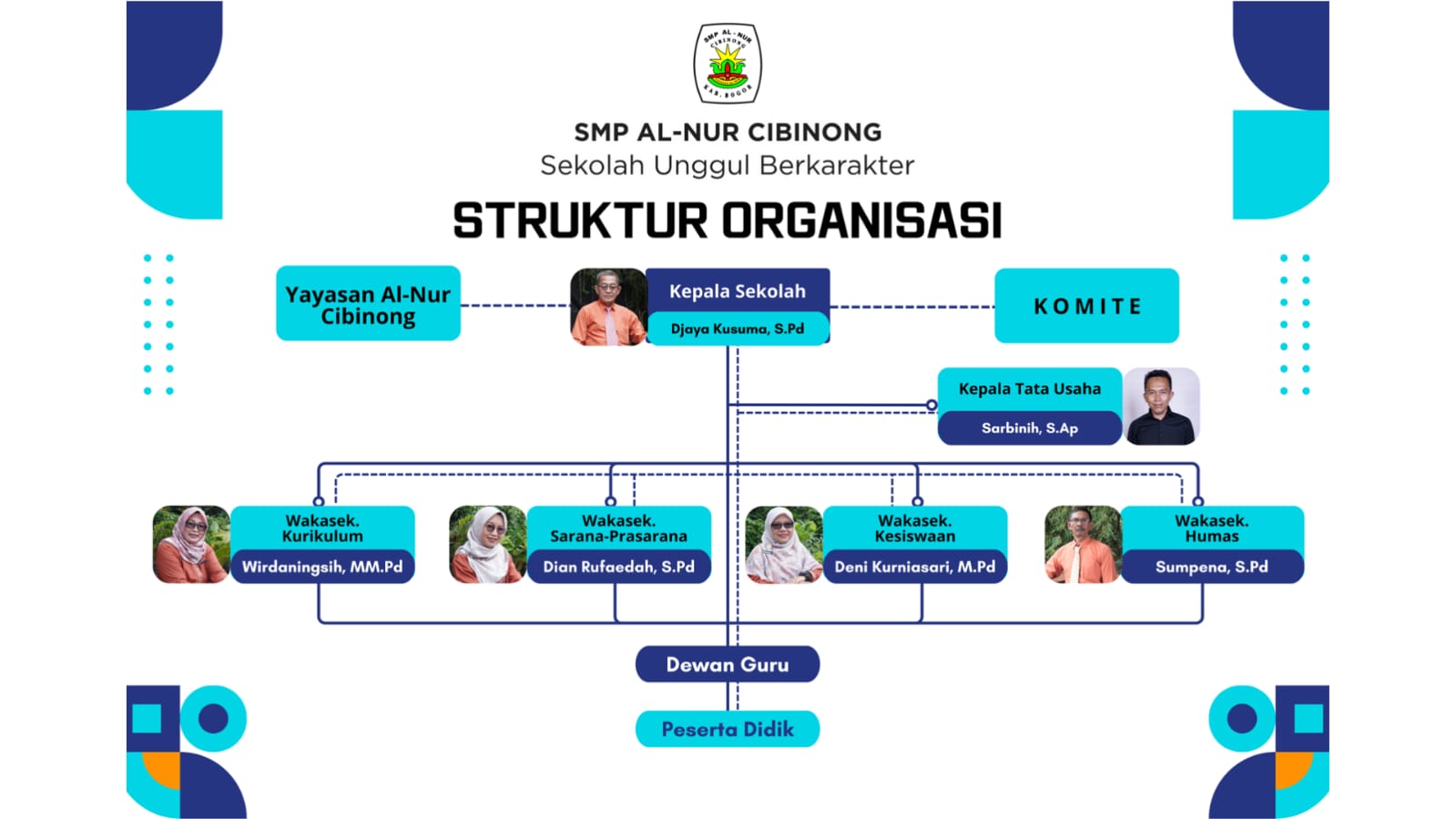 SMP Al-Nur Cibinong dipimpin oleh kepala sekolah yang berpengalaman dan berdedikasi dalam dunia pendidikan. Kepemimpinan yang kuat menjadi fondasi dalam menciptakan lingkungan belajar yang disiplin, religius, dan berprestasi.